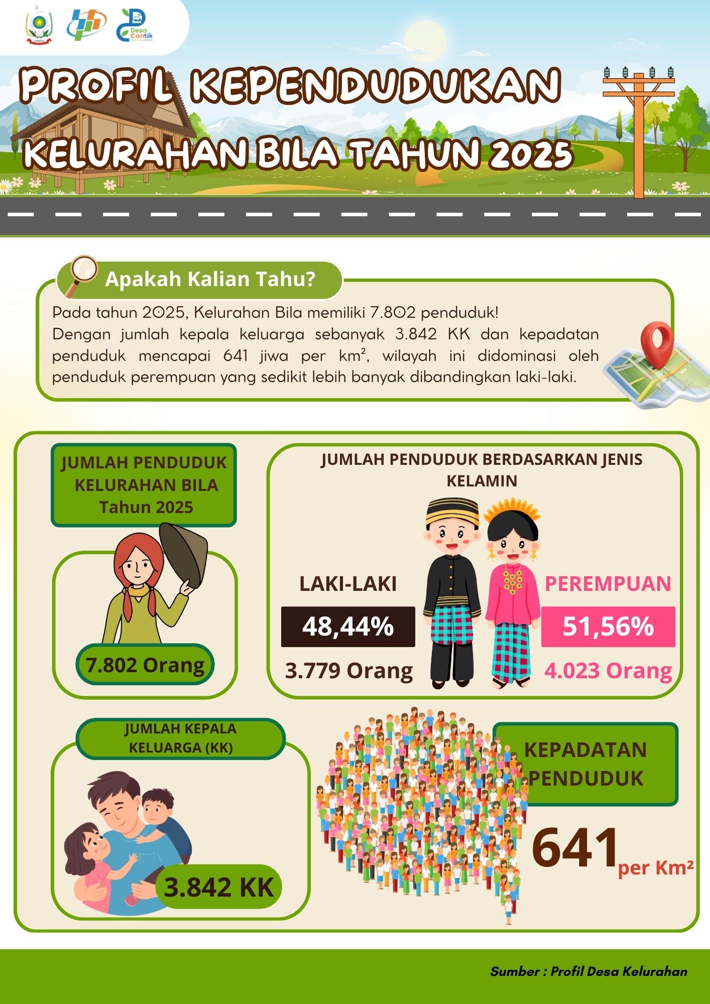 Dengan luas wilayah sekitar 3.500 hektar, Kelurahan Bila dihuni oleh 3.779 Penduduk Laki-Laki, dan 4.023 Penduduk Perempuan. Kelurahan ini terus berkembang dengan dukungan pemerintah setempat dan partisipasi aktif masyarakat.